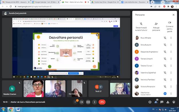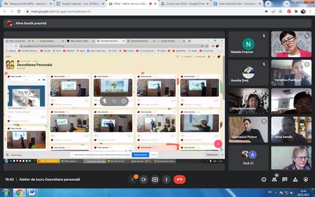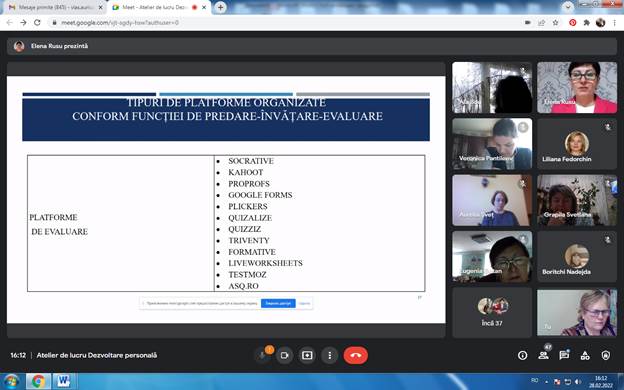 Aurelia Șveț, profesoară, grad didactic superior, LT,,Ștefan cel Mare”Șoldănești a informat despre ,,Resursele educaționale utilizate la Dezvoltarea personală”. Despre ,,Utilizarea tablei digitale Jamboard” a relatat Alina Sandic, profesoară, grad didactic II, din același liceu, care a explicat pașii de creare a contului și utilizare a tablei digitale. Au fost demonstrate produsele elevilor, create în această aplicație la diferite subiecte, a demonstrat oportunitatea acestei aplicații pentru profesori.