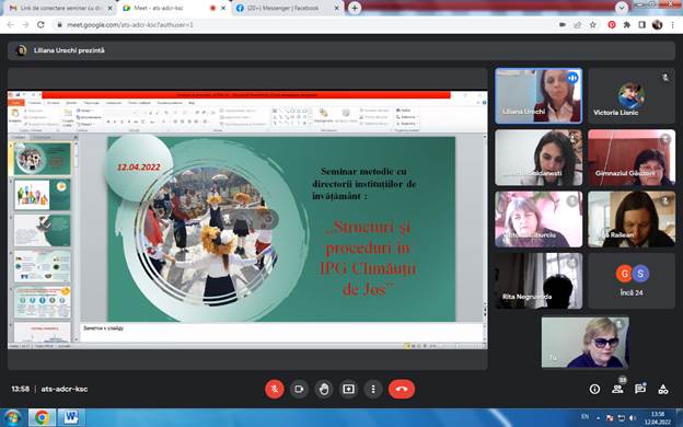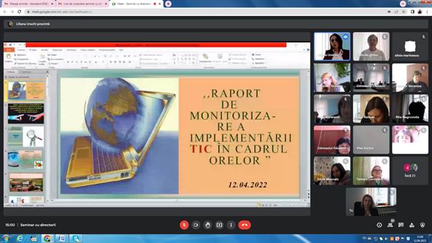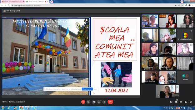 Data de 12.04.2022 a fost una remarcabilă pentru IP Gimnaziul Climăuții de Jos, care a fost gazdă a seminarului metodic raional online cu directorii instituţiilor de învăţământ din raion cu subiectul: ,,Cultura organizațională a instituției de învățământ – factor de asigurare a calității educației. Structuri și proceduri ”, desfășurat în conformitate cu Planul de activitate a Direcției Învățământ Șoldănești, coordonator – d-na Oprea Diana, șefa Centrului Metodic.
