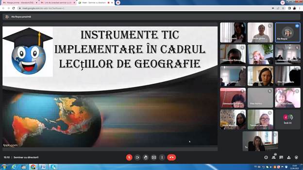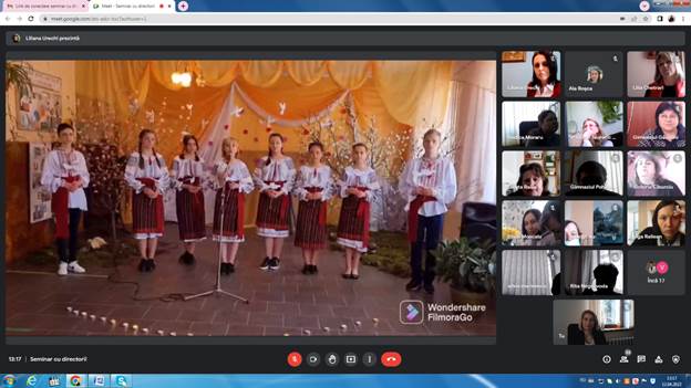 D-na Namolovan Lucia, profesoară de geografie a prezentat Cartea de vizită a instituției, astfel oaspeții seminarului au făcut cunoștință cu unitatea de învățământ, valorile promovate, activitățile desfășurate în instituție, colaborările/ parteneriatele existente. Elevii din gimnaziu au venit cu un mesaj de salut pentru oaspeți, bucurând sufletele și privirile prin poezie, cântec, dans, voie bună, optând pentru ,,Pace pe Pământ”.